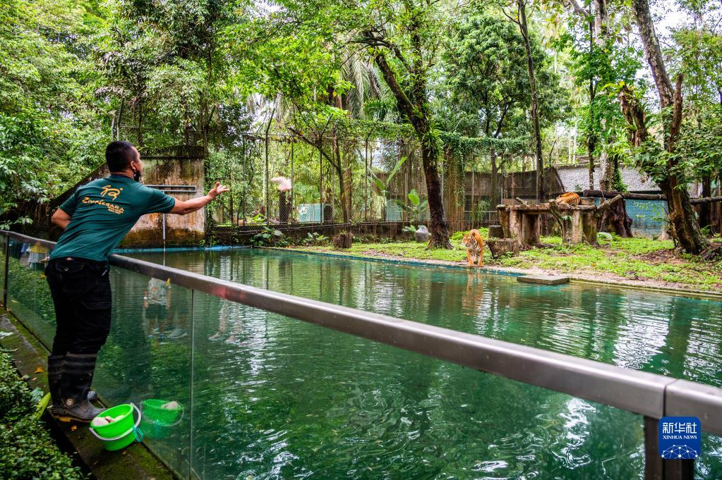 2月27日,在马来西亚吉隆坡附近的国家动物园,饲养员投喂马来亚虎。