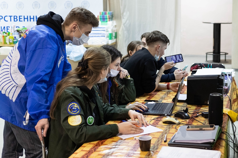 ↑3月2日,在俄罗斯顿河畔罗斯托夫的一所大学内,志愿者登记当地居民为来自顿巴斯地区的民众捐赠的物资。