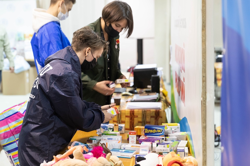 ↑3月2日,在俄罗斯顿河畔罗斯托夫的一所大学内,志愿者整理当地居民为来自顿巴斯地区的民众捐赠的药品。