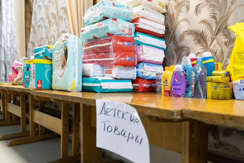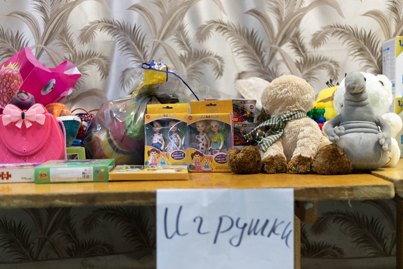 ↑这是3月2日在俄罗斯顿河畔罗斯托夫的一所大学内拍摄的当地居民为来自顿巴斯地区的民众捐赠的玩具。