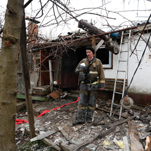 2月28日,在顿涅茨克,一名消防员站在损坏的房屋前。新华社发(维克多摄)