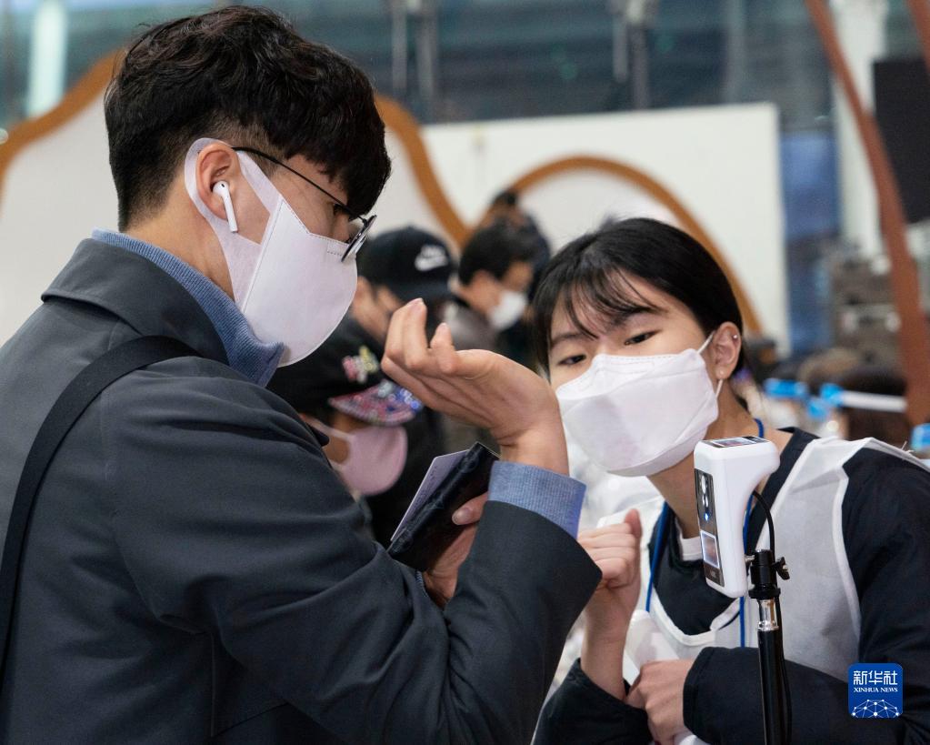 3月4日,在韩国首尔一个投票站,选民投票前接受体温检测。