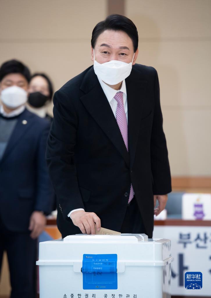 3月4日,国民力量党总统候选人尹锡悦在韩国釜山一个投票站投票。