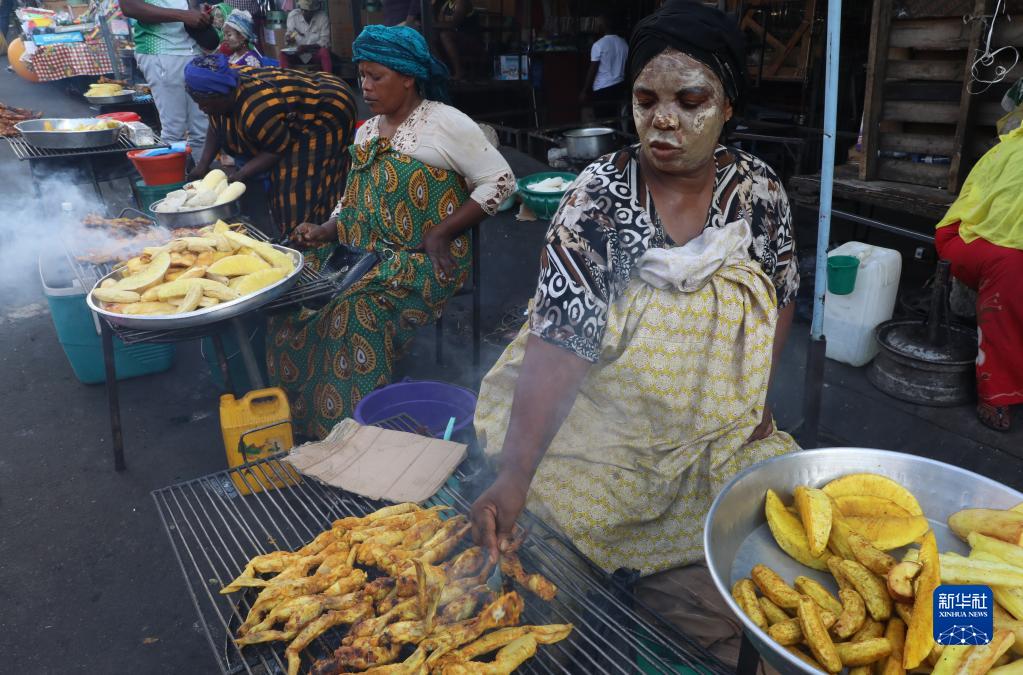 1月12日,在科摩罗首都莫罗尼,一名抹着天然面膜的女子在集市上售卖食物。