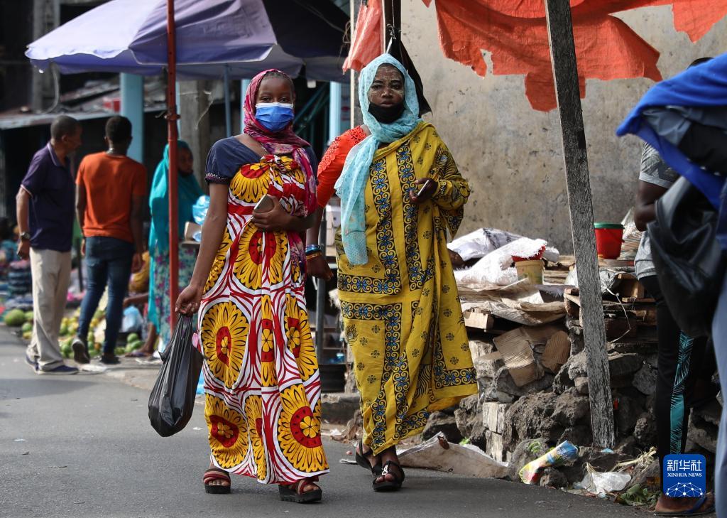 1月11日,在科摩罗首都莫罗尼,抹着天然面膜的女子走在集市上。