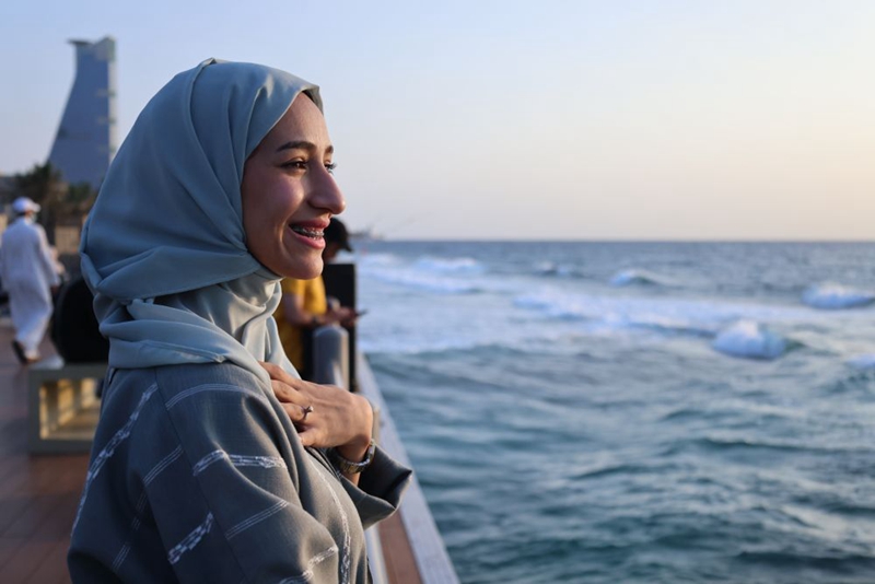 艾依莎·哈姆利在沙特西部城市吉达的海滨大道欣赏日落。(新华社记者王海洲摄)