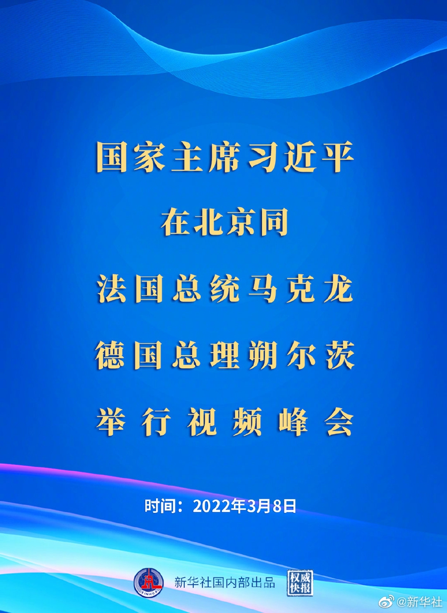 国家主席习近平3月8日下午在北京同法国总统马克龙、德国总理朔尔茨举行视频峰会。