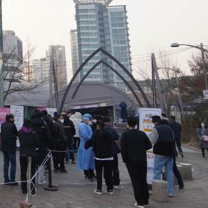 3月9日,人们在韩国首尔一处新冠检测点排队等待检测。