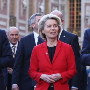 3月10日,在法国巴黎近郊的凡尔赛宫,欧盟委员会主席冯德莱恩(中)准备拍摄全家福。