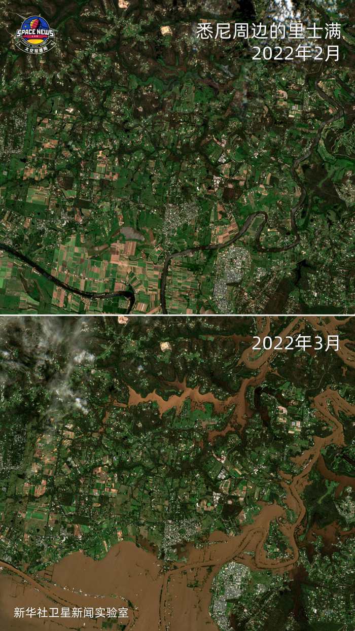 悉尼周边的里士满,受暴雨侵袭,卫星图上,原先的河道难以辨认。