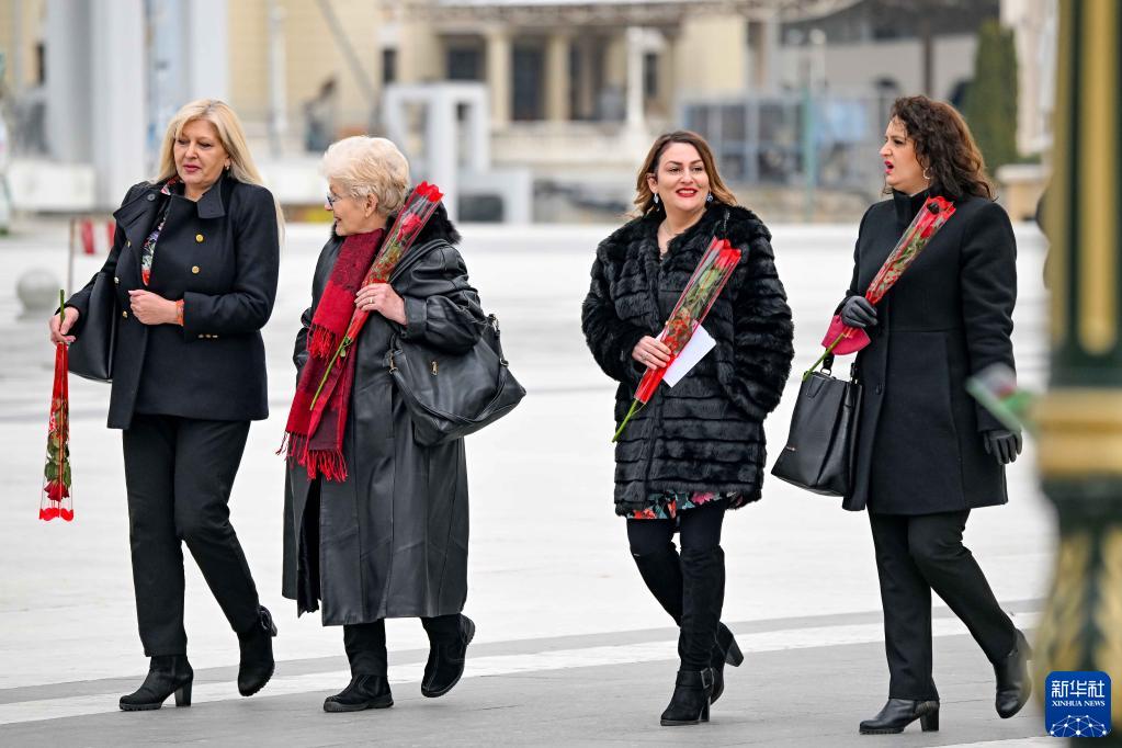 3月8日,几名女士手持鲜花走在北马其顿斯科普里的广场上。