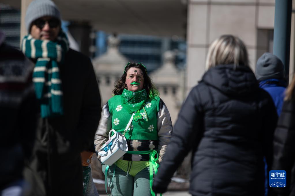 3月12日,在美国芝加哥,一名女子身着绿装参加圣帕特里克节庆祝活动。