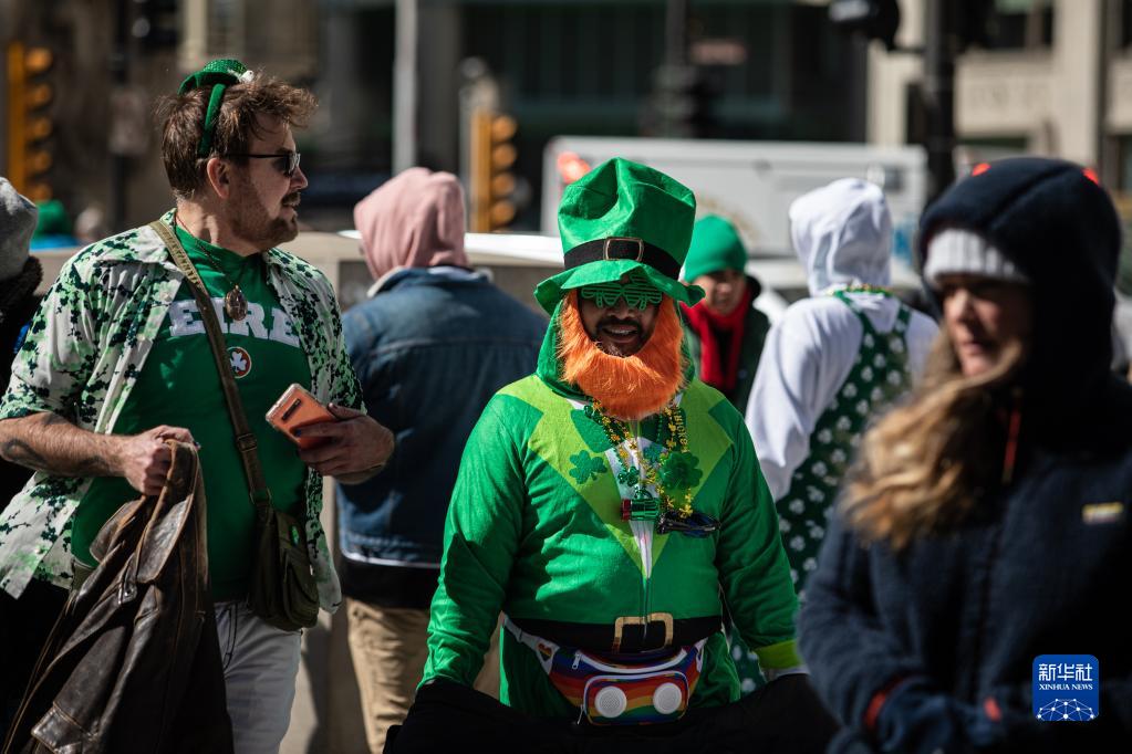 3月12日,在美国芝加哥,身着绿装的人们聚集在芝加哥河畔。