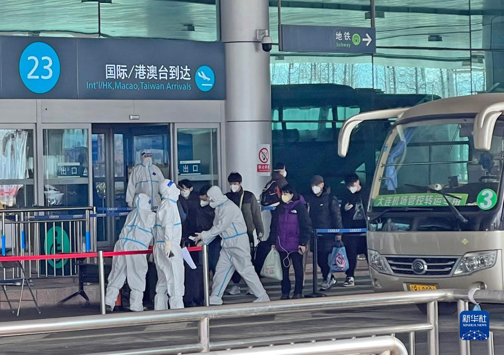 3月14日,乘坐临时航班抵达大连周水子国际机场的中国公民准备前往隔离酒店。新华社发(大连机场提供)