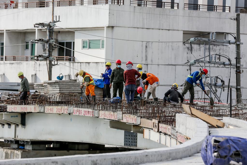 2022年3月3日,工人在菲律宾首都马尼拉比农多-王城大桥施工现场。(鲁埃勒·乌马利摄)