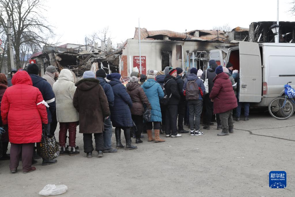 3月15日,当地居民在顿涅茨克的沃尔诺瓦哈排队领取人道主义援助物资。