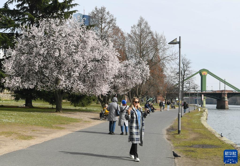 3月16日,人们在德国法兰克福美因河畔休闲。