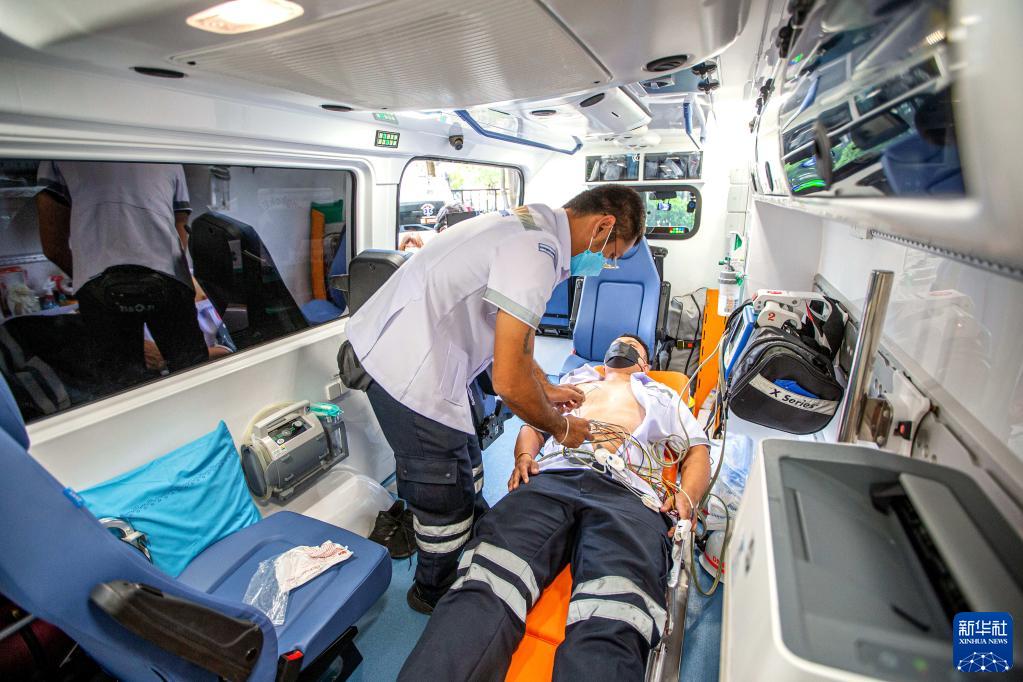 2月14日,医护人员在泰国曼谷诗里拉吉医院的5G救护车中演示救治患者。