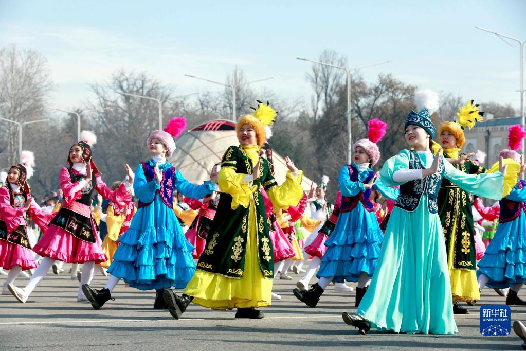 3月21日,人们在吉尔吉斯斯坦首都比什凯克阿拉套广场举行的纳乌鲁斯节庆典上表演舞蹈。