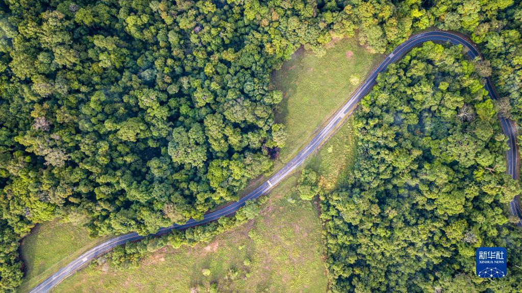这是3月21日在泰国考艾国家公园拍摄的森林与道路(无人机照片)。