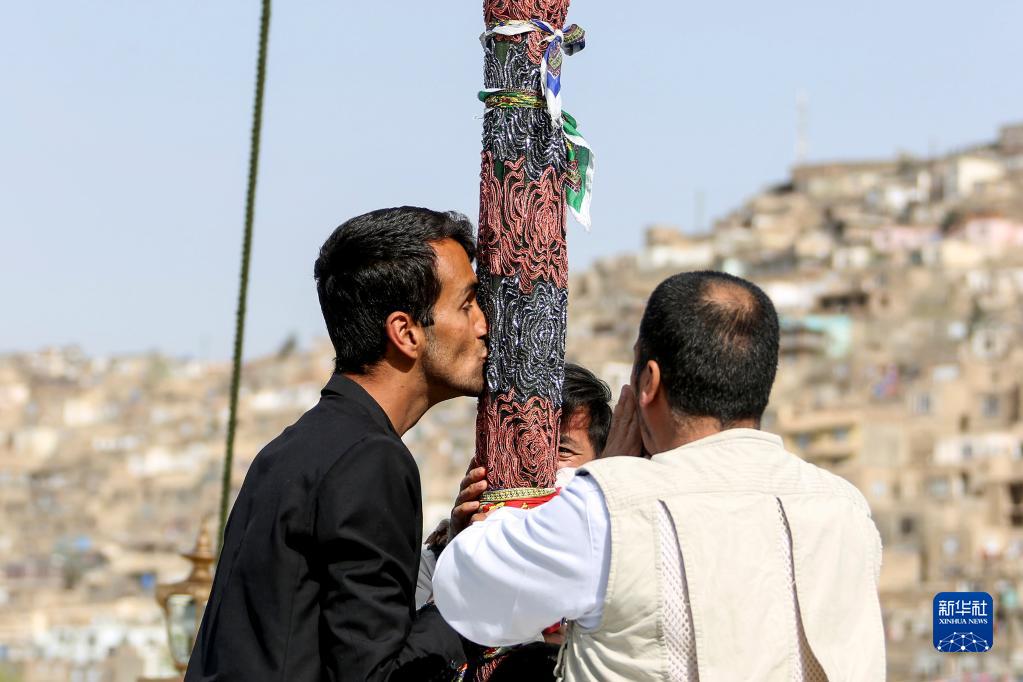 3月21日,人们在阿富汗喀布尔的诺鲁孜节庆祝活动上亲吻一根柱子。