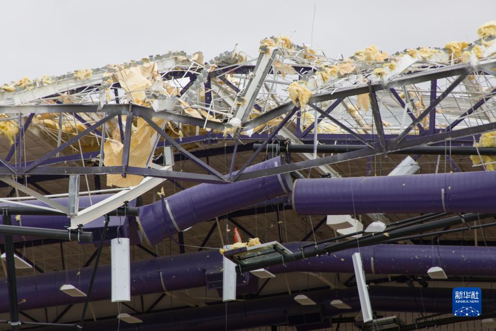 这是3月22日在美国得克萨斯州北部小城杰克斯伯勒拍摄的在龙卷风袭击中损坏的学校建筑。