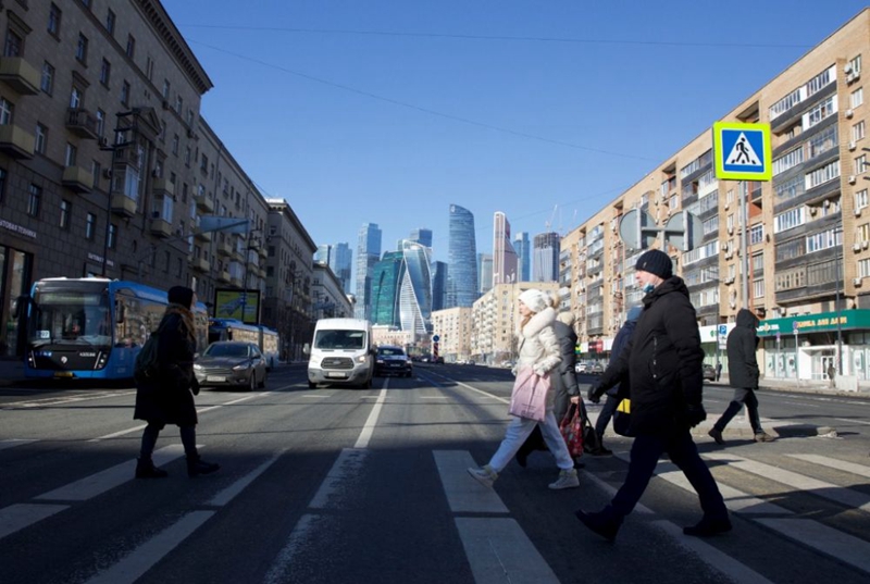 3月9日,在俄罗斯首都莫斯科,市民穿过一条马路。新华社记者白雪骐摄