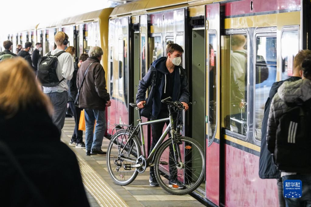 3月24日,在德国首都柏林,一名戴口罩的男子搭乘城市快铁列车。