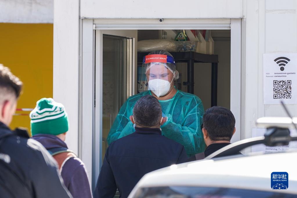 3月24日,在德国首都柏林,一名新冠病毒检测站的工作人员为一名男子检测。