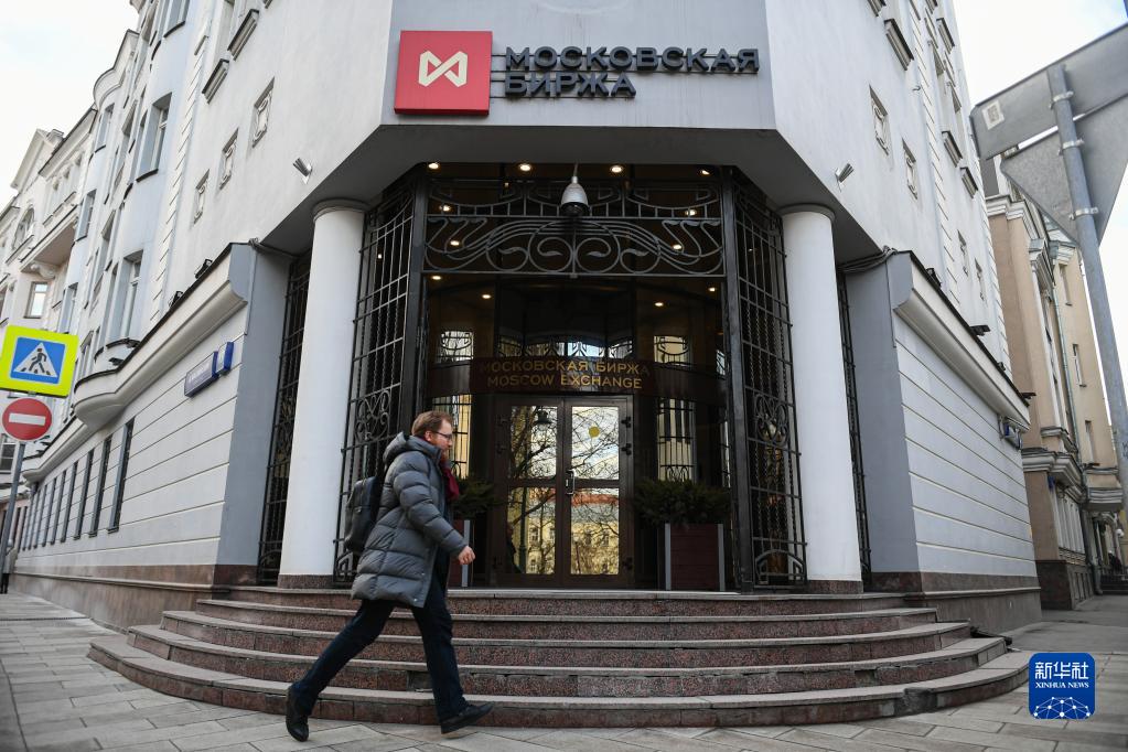 这是2月24日拍摄的位于俄罗斯首都莫斯科的莫斯科证券交易所的资料照片。俄罗斯股市休市近一个月后,于3月24日恢复部分股票交易。截至收盘,莫斯科证券交易所指数上涨4.37%,盘中一度涨超10%。新华社发(叶甫盖尼·西尼岑摄)