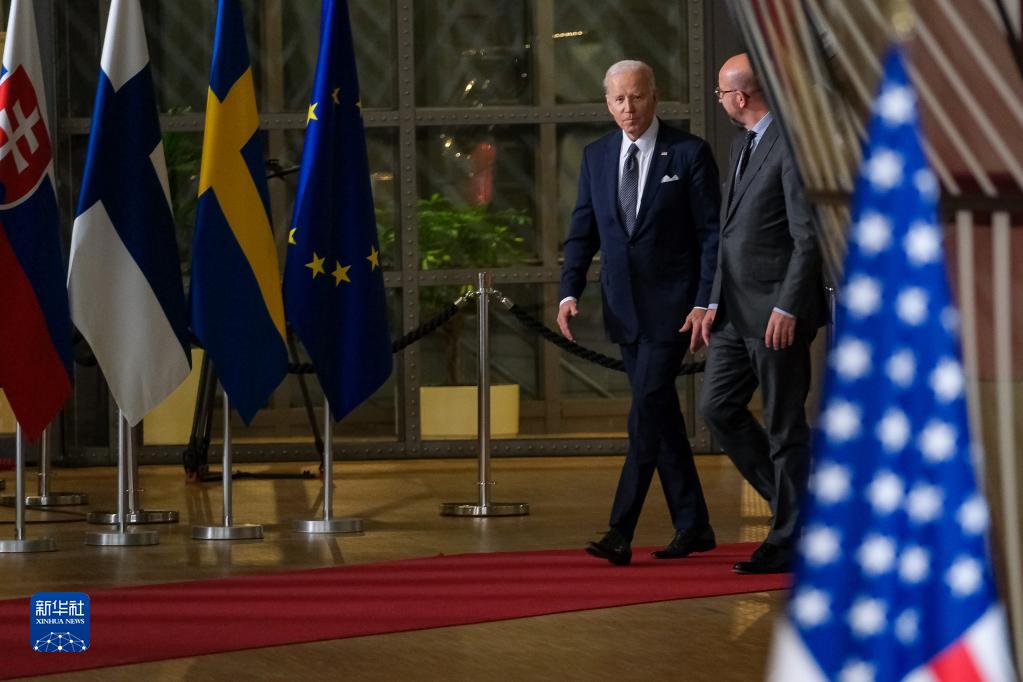 3月24日,美国总统拜登(左)和欧洲理事会主席米歇尔抵达欧盟总部。新华社记者 张铖 摄