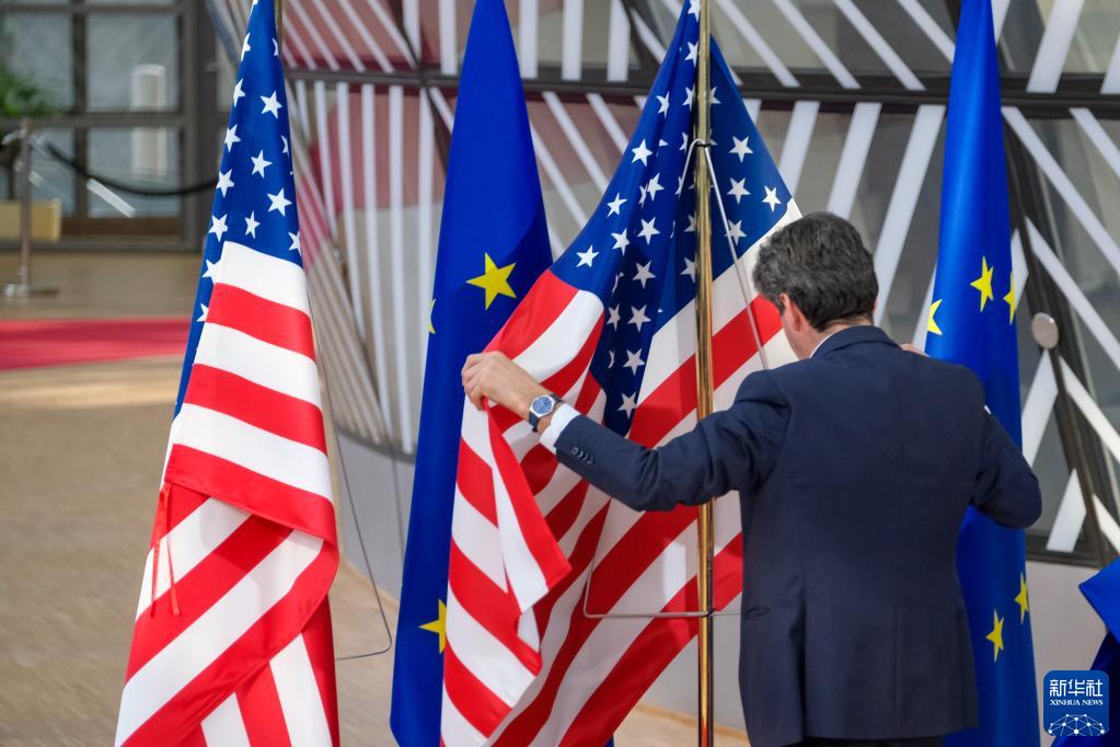 3月24日,工作人员在比利时布鲁塞尔的欧盟总部整理美国国旗。