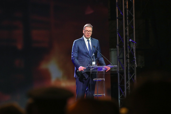 3月24日,在塞尔维亚中部城市克拉列沃,塞尔维亚总统武契奇在悼念北约轰炸南斯拉夫联盟共和国遇难者仪式上致辞。新华社记者石中玉摄