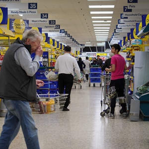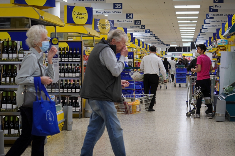↑3月23日,在英国贝辛斯托克,人们在一家超市购物。