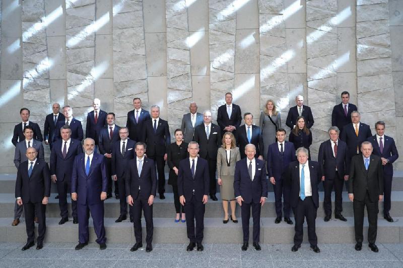 3月24日,在比利时布鲁塞尔的北约总部,领导人在会议期间合影。新华社记者郑焕松摄