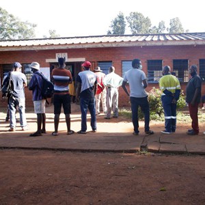 3月26日,选民(左一)在津巴布韦首都哈拉雷的一个投票点投票。新华社发(肖恩·朱萨摄)