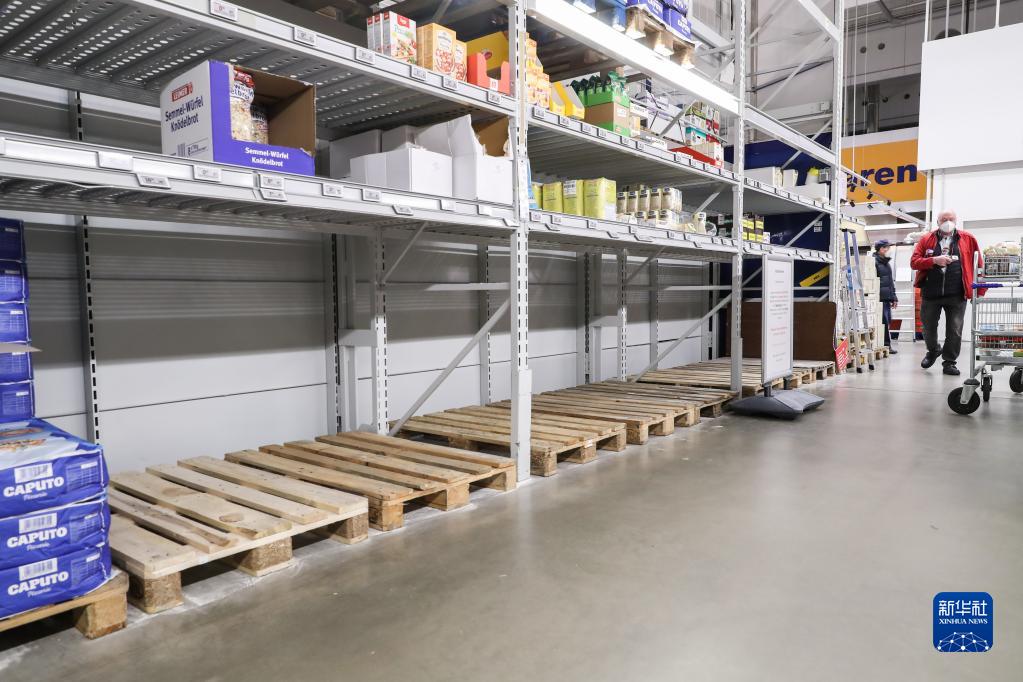 3月26日,在德国首都柏林的一家超市,一名顾客经过商品短缺的面粉货架。