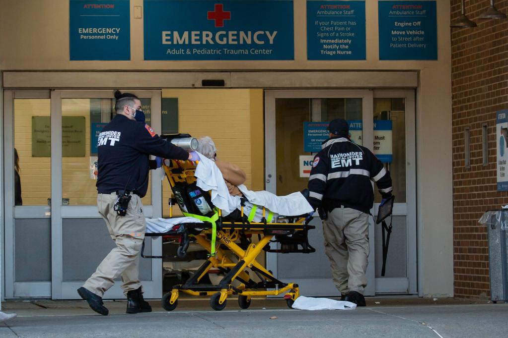 图为2021年12月14日,在美国纽约,工作人员将一名病人送入医院。新华社发(郭克 摄)