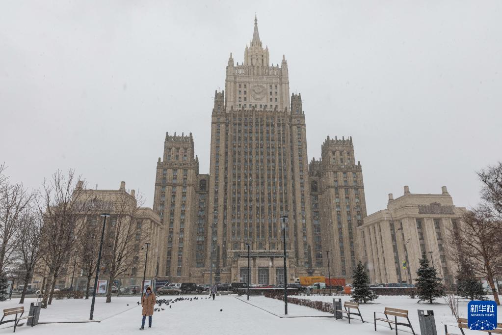 3月28日,在俄罗斯首都莫斯科,行人从俄罗斯外交部大楼附近走过。