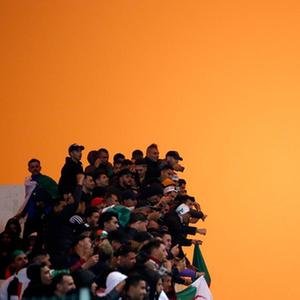3月29日,在阿尔及利亚卜利达,球场上的观众在沙尘中等待比赛开始。