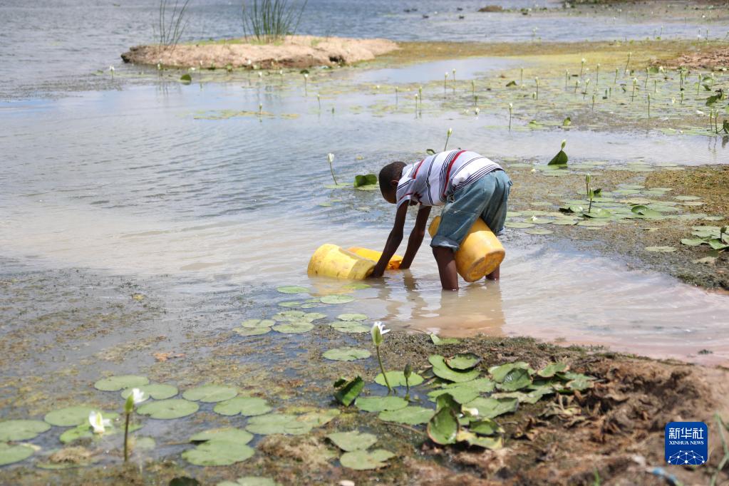 3月23日,一名男孩在肯尼亚基利菲的一个储水设施中取水。