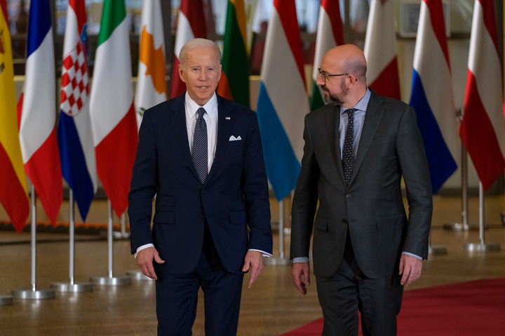 3月24日,美国总统拜登(左)和欧洲理事会主席米歇尔抵达欧盟总部。新华社记者张铖摄