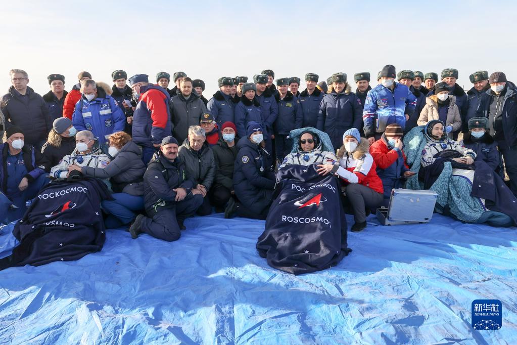 3月30日,在哈萨克斯坦杰兹卡兹甘附近,美国宇航员马克·范德·海(左)、俄罗斯宇航员彼得·杜布罗夫(右)和安东·什卡普列罗夫与工作人员合影。