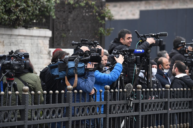 ↑3月29日,媒体记者聚集在土耳其伊斯坦布尔的俄乌代表团谈判会场外。新华社记者 沙达提 摄