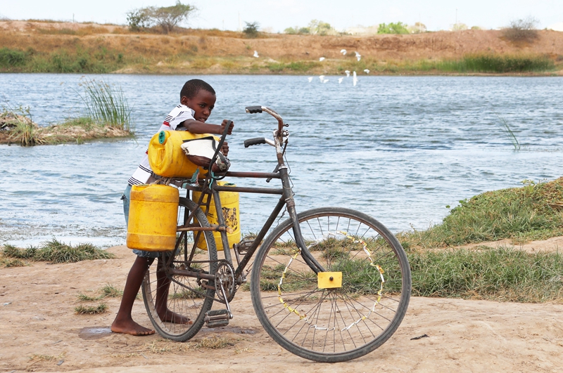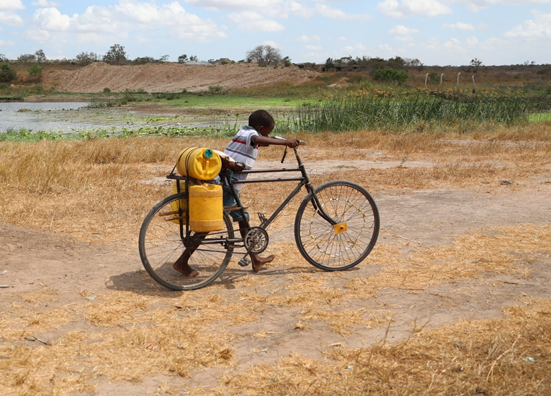 ↑3月23日,在肯尼亚基利菲的一个储水设施旁,一名男孩将装满水的水桶固定在自行车上。