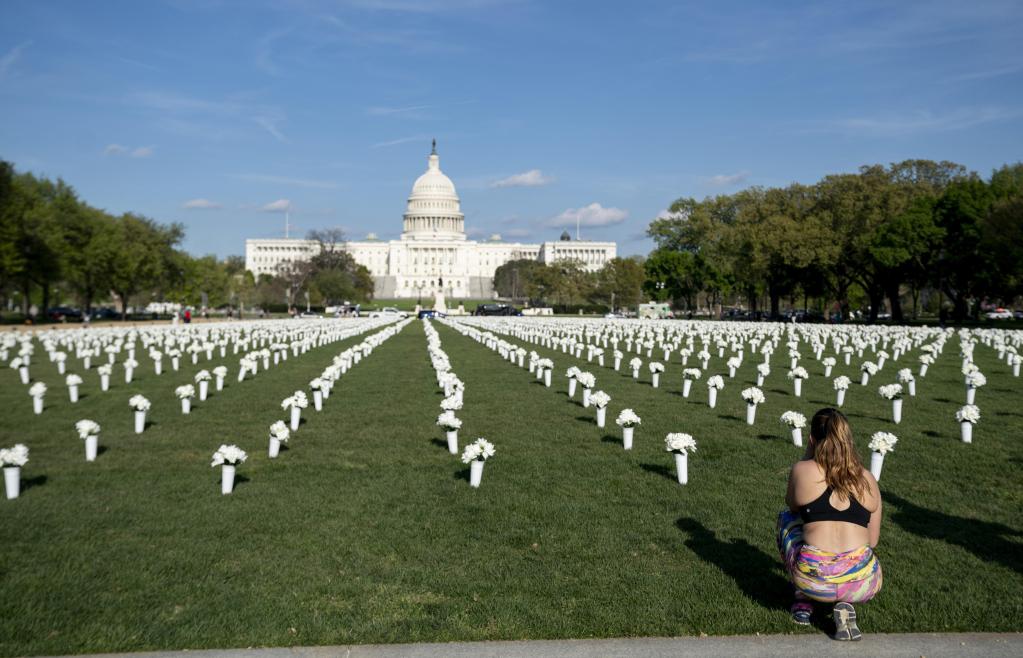 2021年4月13日,一名女子观看美国华盛顿国家广场草坪上摆放的白色绢花。新华社记者 刘杰 摄