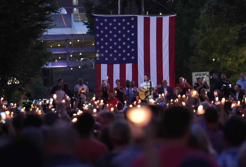 2019年8月4日,在美国俄亥俄州代顿市,人们为枪击事件遇难者举行悼念活动。美国俄亥俄州代顿市8月4日凌晨发生一起枪击事件,造成包括枪手在内的至少10人死亡。新华社记者 刘杰 摄