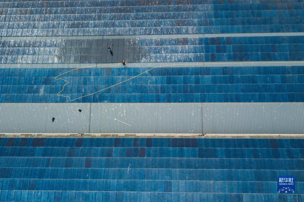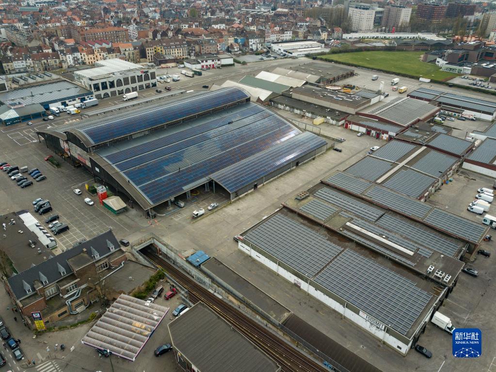 3月29日,工作人员在比利时布鲁塞尔安德莱赫特屠宰场棚顶上清洁太阳能板(无人机照片)。新华社记者 张铖 摄