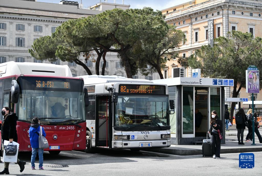 4月1日,人们在意大利罗马一处公交车站候车。