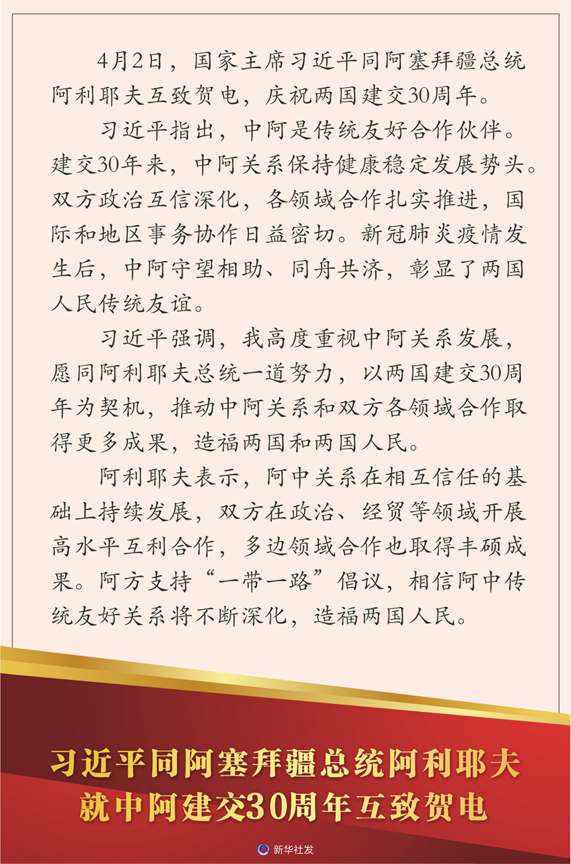 新华社北京4月2日电 4月2日,国家主席习近平同阿塞拜疆总统阿利耶夫互致贺电,庆祝两国建交30周年。
